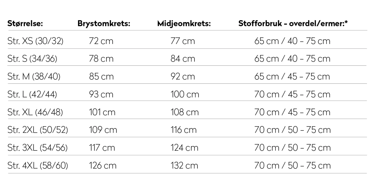 Stofforbruket er målt med utgangspunkt i 150 cm bredt stoff. Vær obs på at stoffforbruket krever fornuftig plassering av mønsterdelene på stoffet.